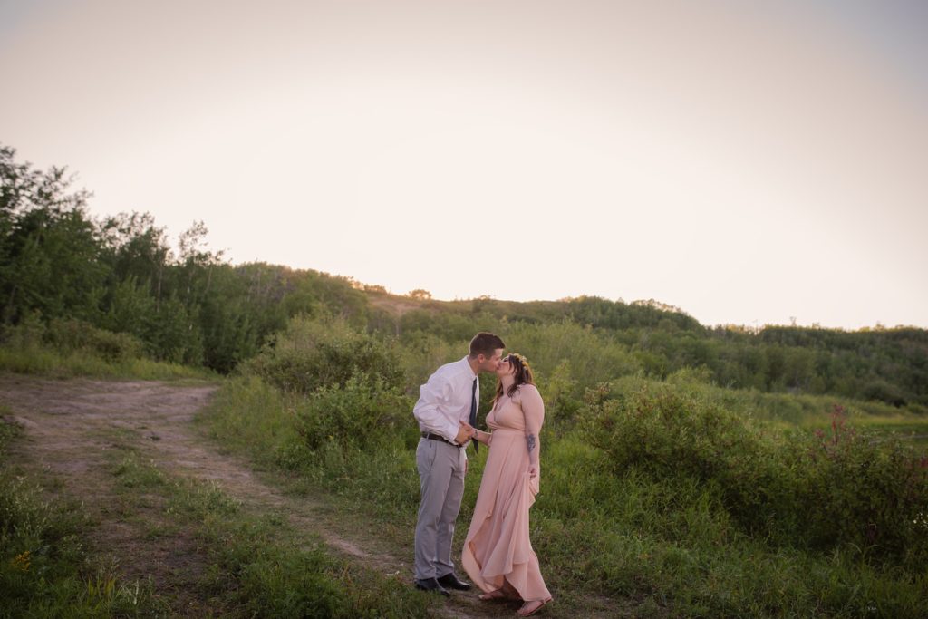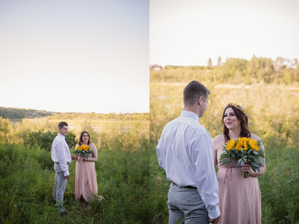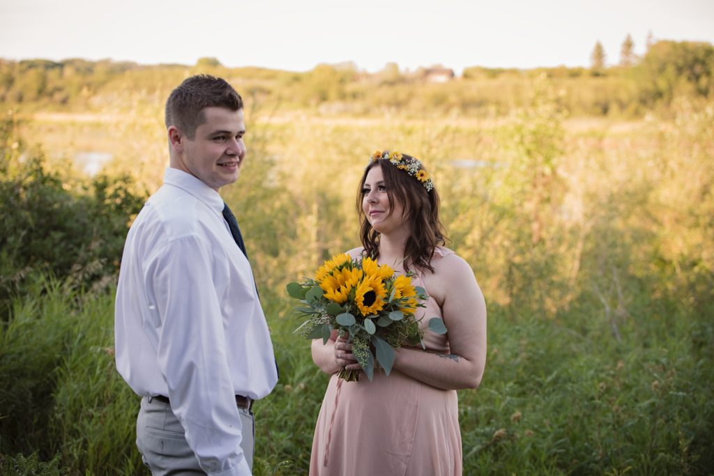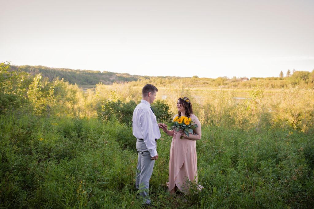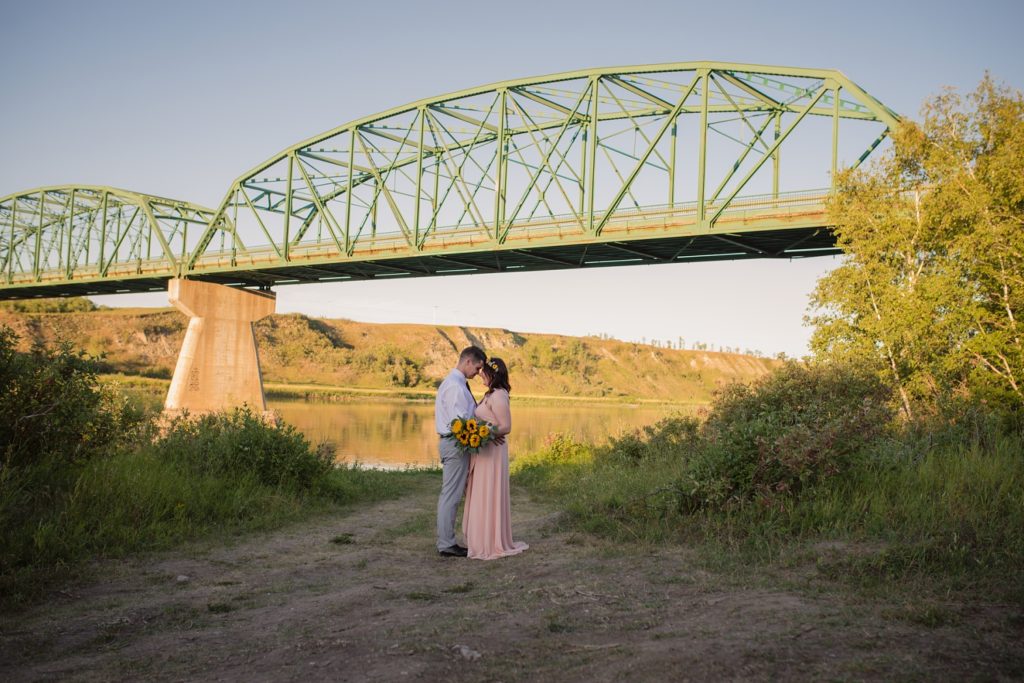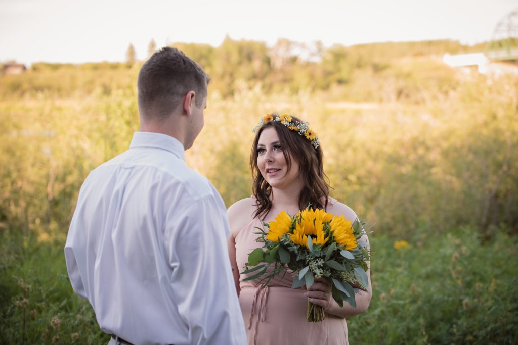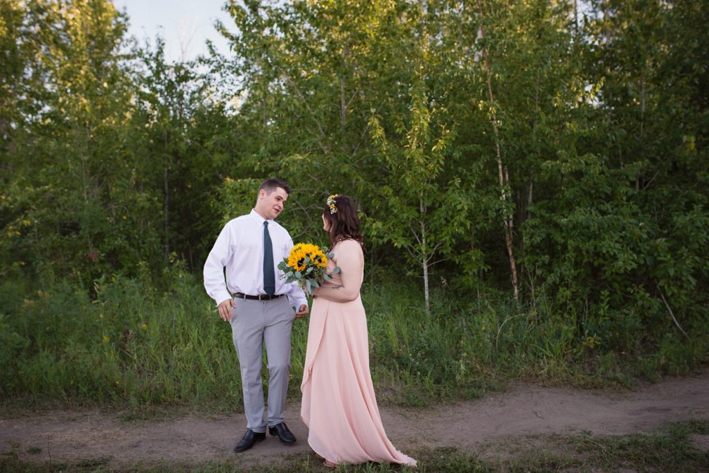 We drove out to meet at the Gabriel Bridge near Rosthern, Saskatchewan. They chose that location because they met in Rosthern when they were in high school. We did a quick first look before they exchanged vows and then continued on with taking photos in the late evening summer sun.