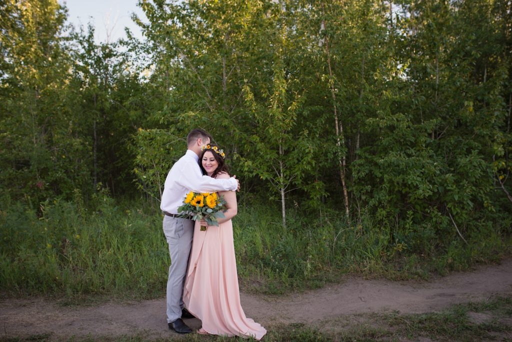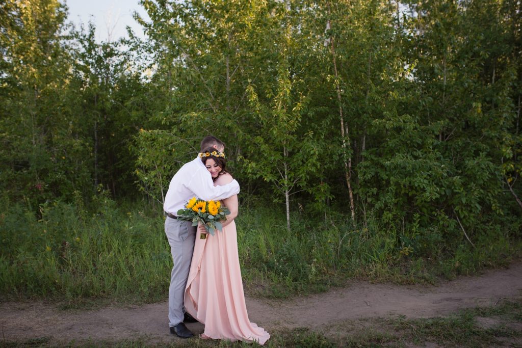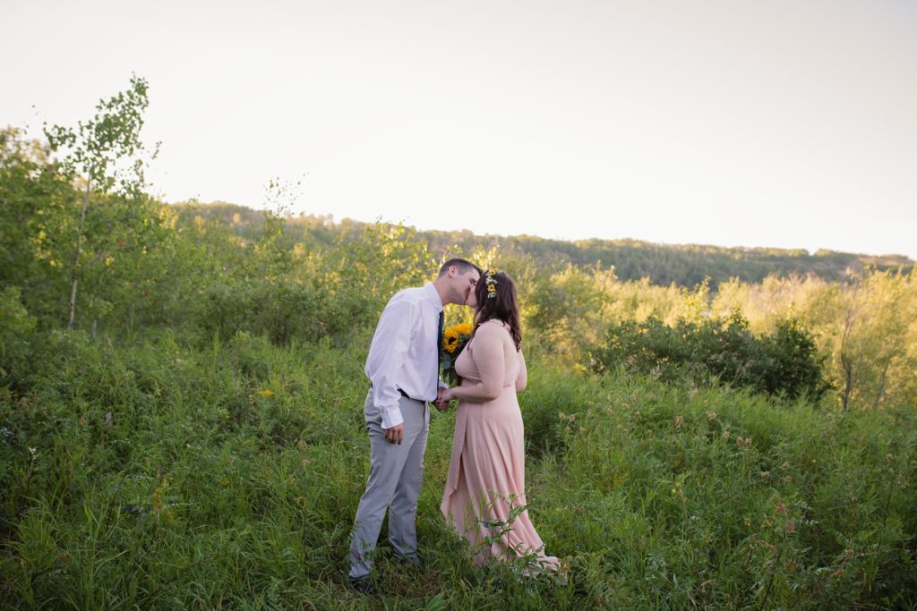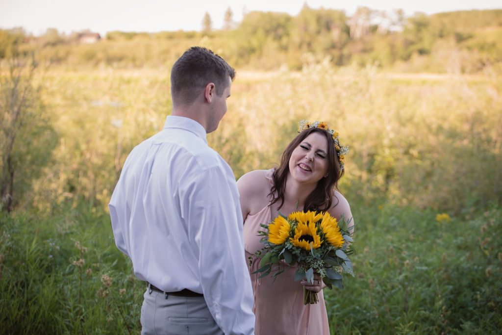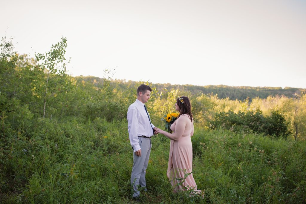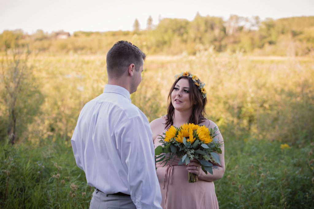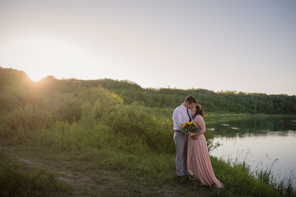 We drove out to meet at the Gabriel Bridge near Rosthern, Saskatchewan. They chose that location because they met in Rosthern when they were in high school. We did a quick first look before they exchanged vows and then continued on with taking photos in the late evening summer sun.