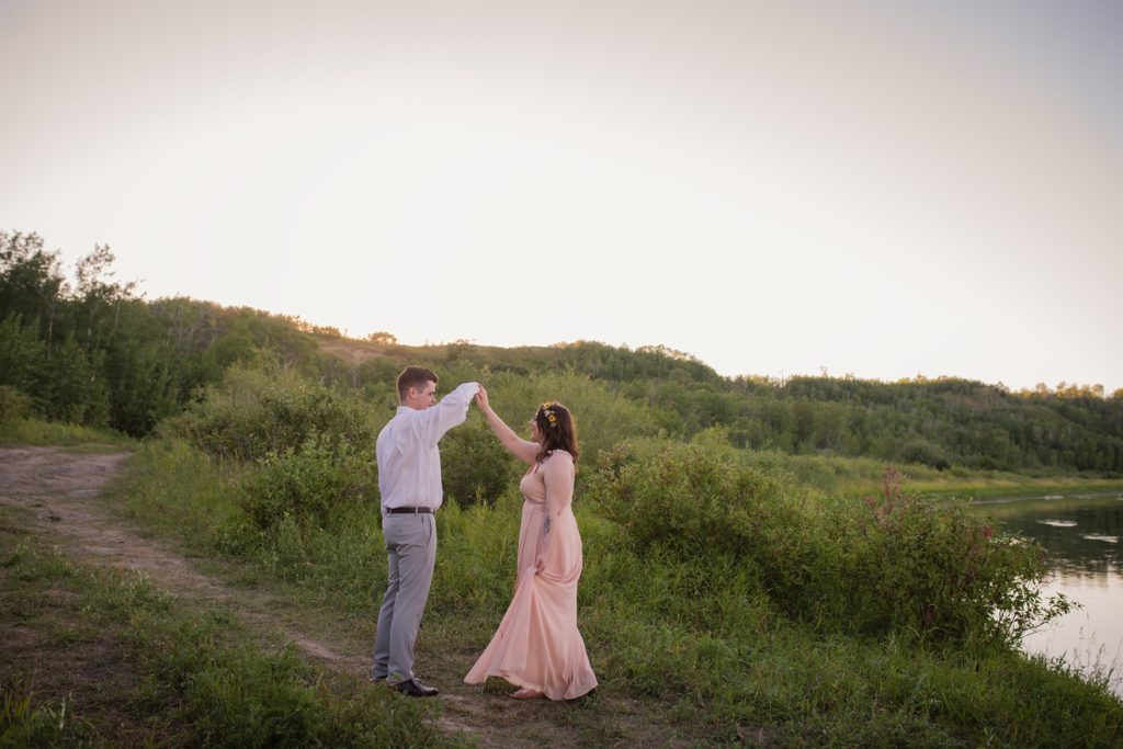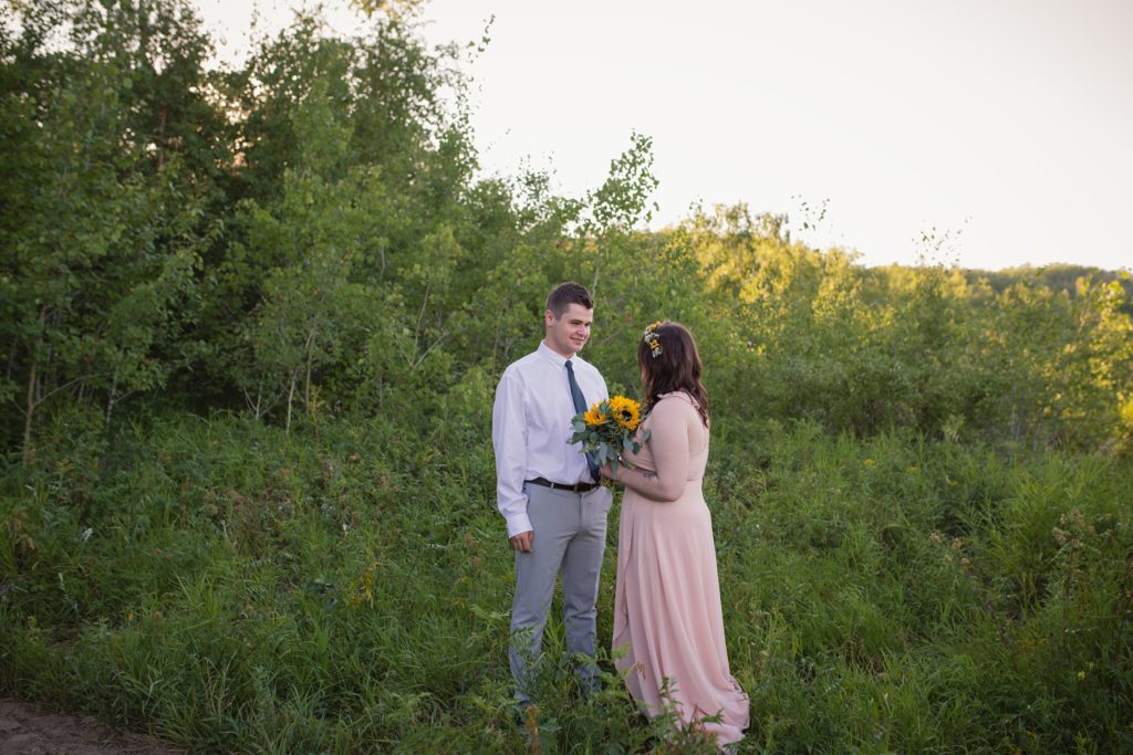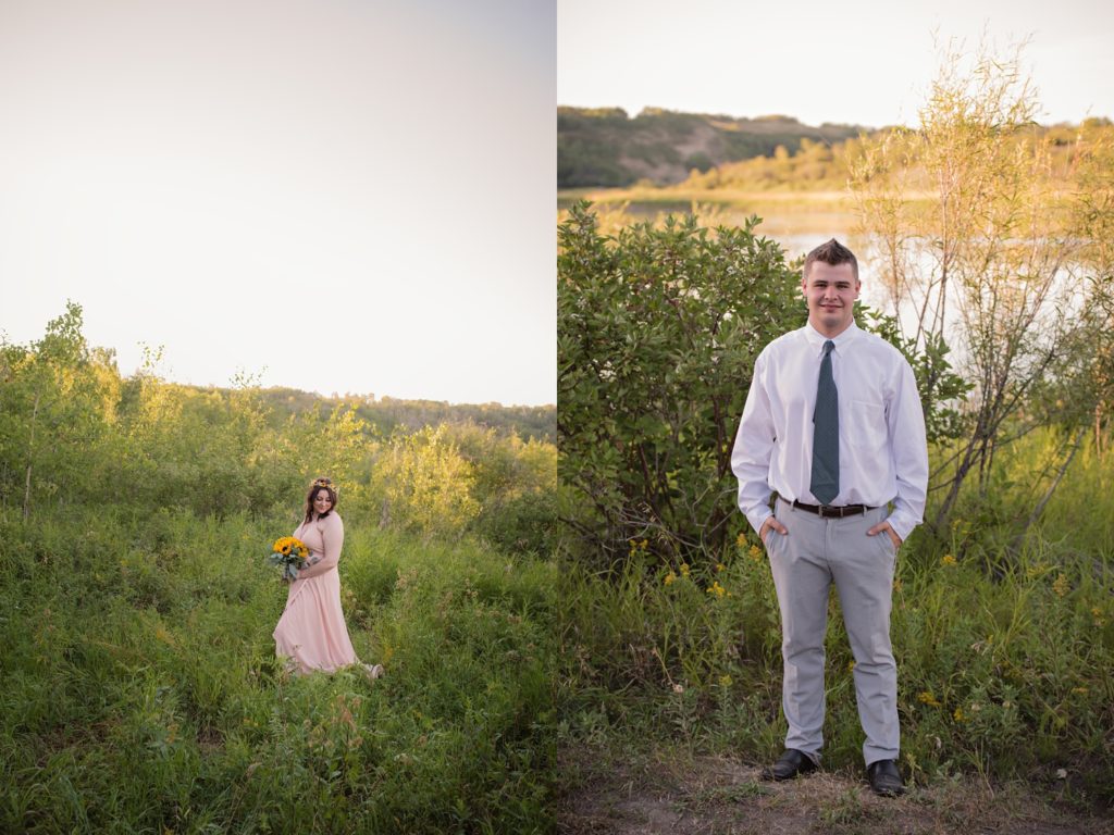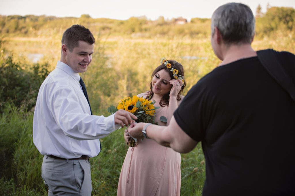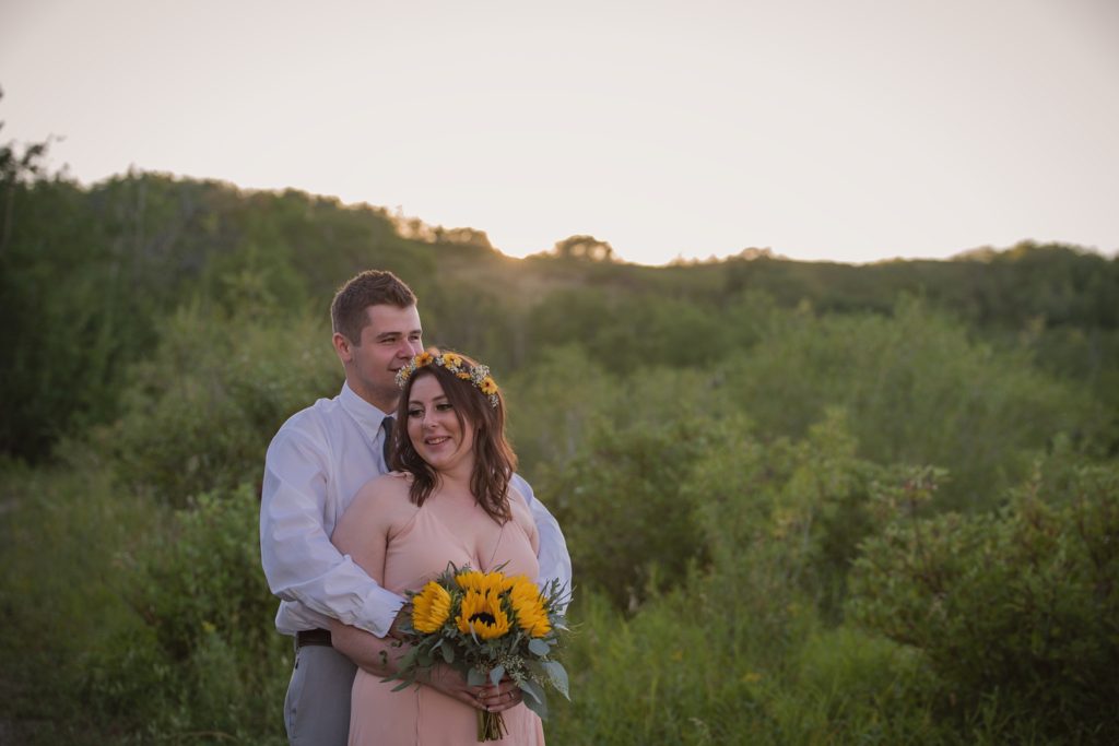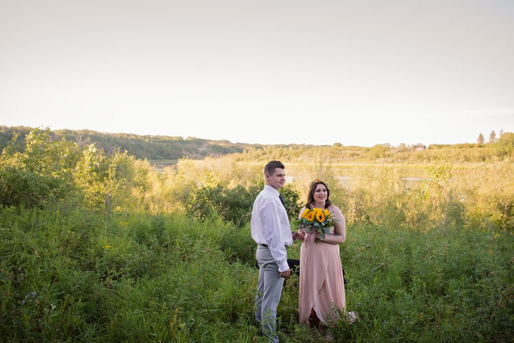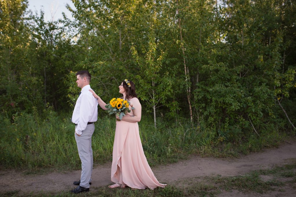 We drove out to meet at the Gabriel Bridge near Rosthern, Saskatchewan. They chose that location because they met in Rosthern when they were in high school. We did a quick first look before they exchanged vows and then continued on with taking photos in the late evening summer sun.