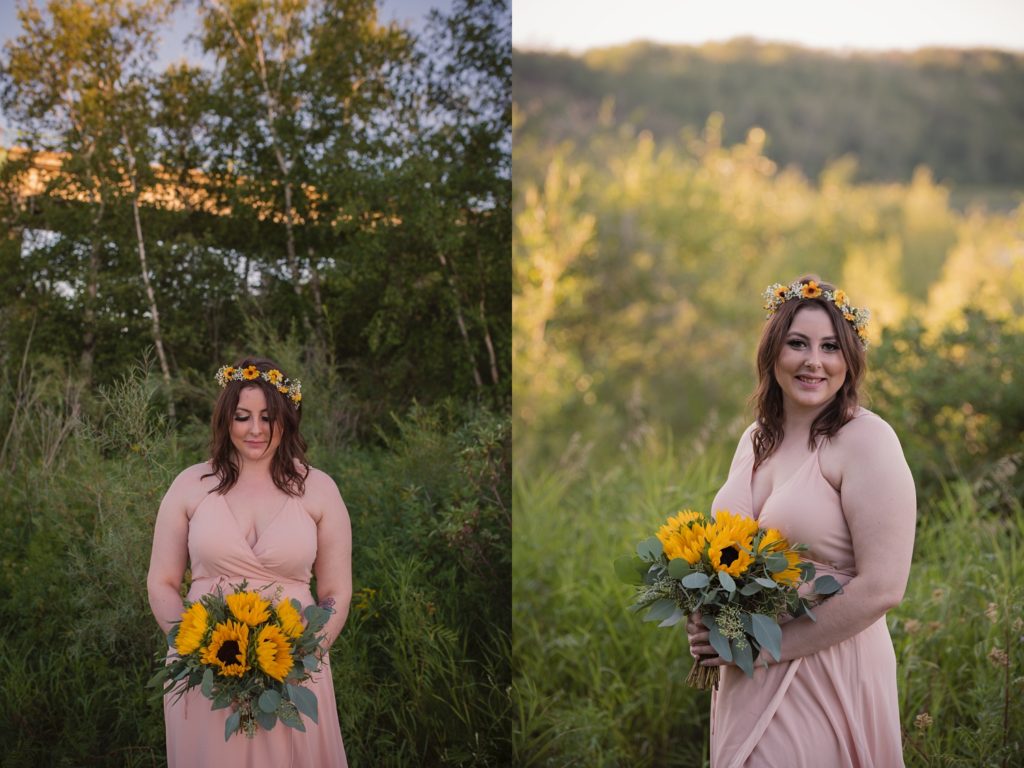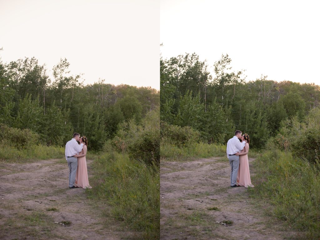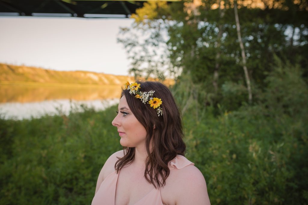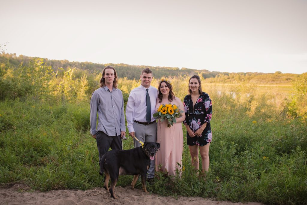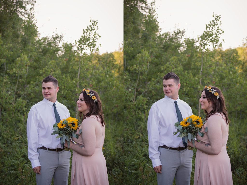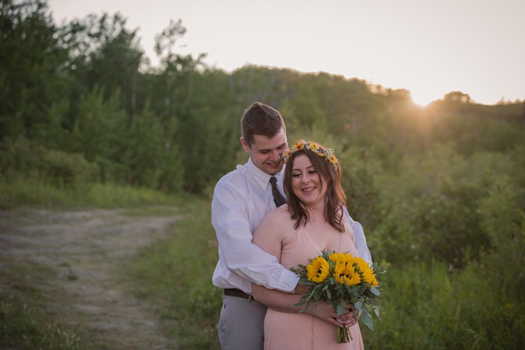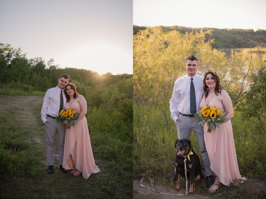 We drove out to meet at the Gabriel Bridge near Rosthern, Saskatchewan. They chose that location because they met in Rosthern when they were in high school. We did a quick first look before they exchanged vows and then continued on with taking photos in the late evening summer sun.