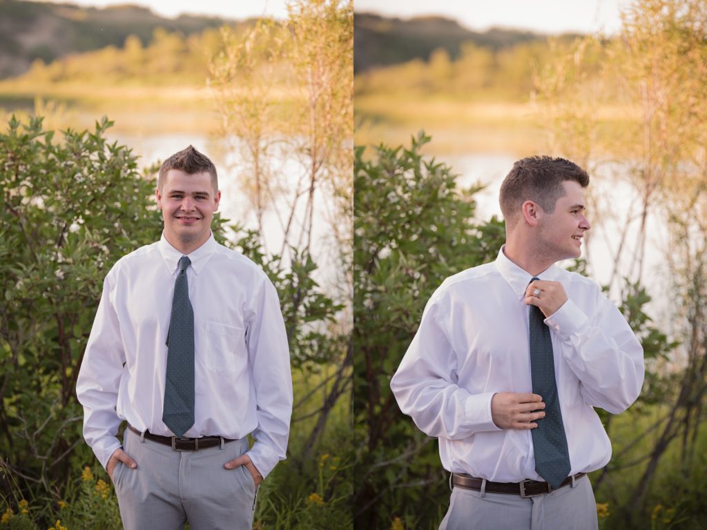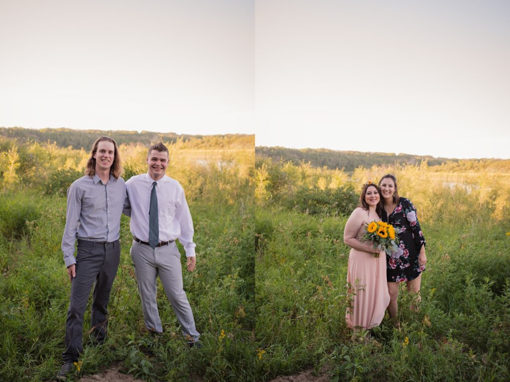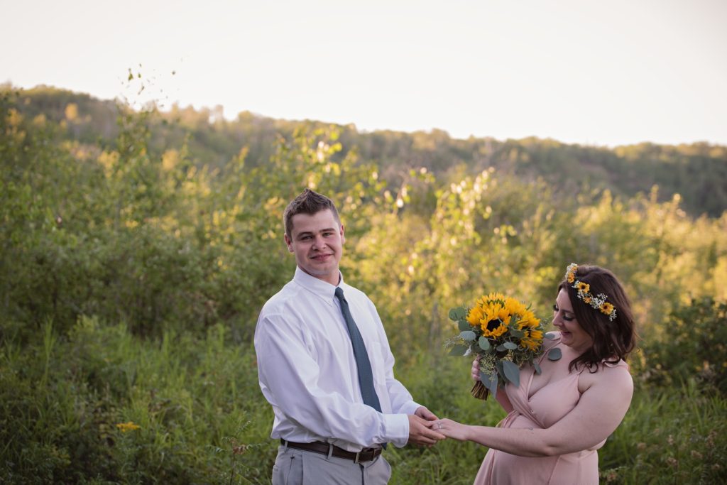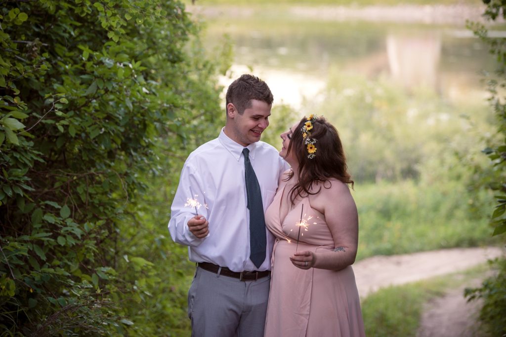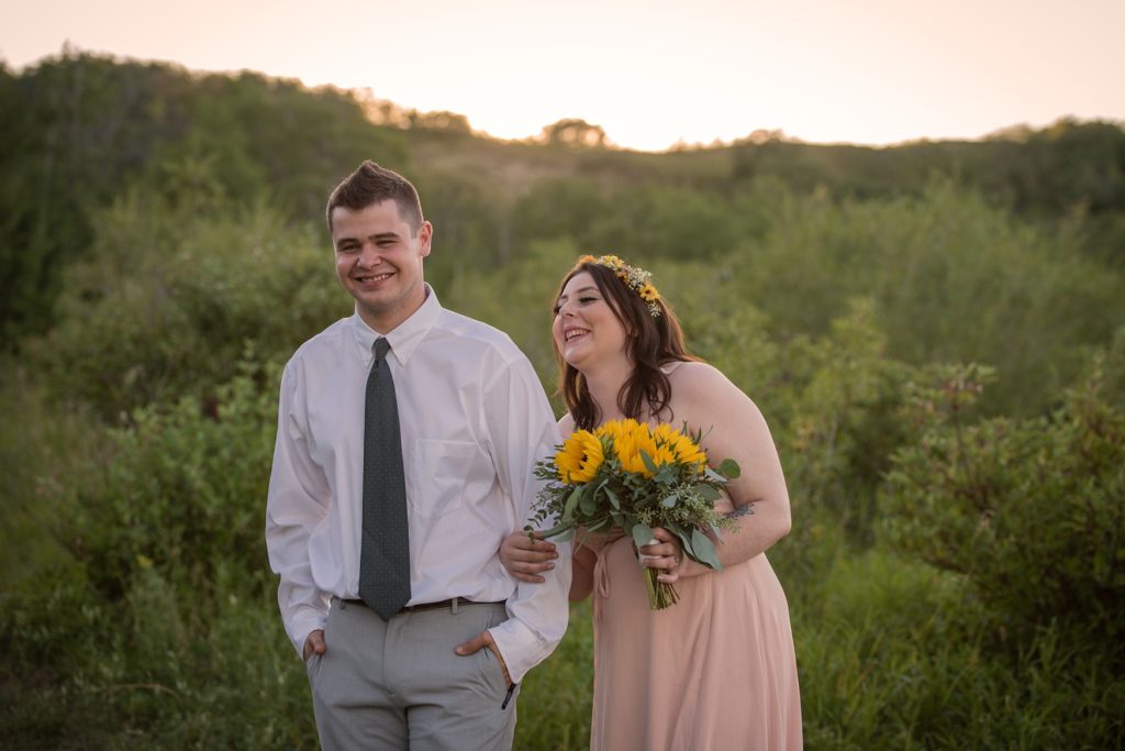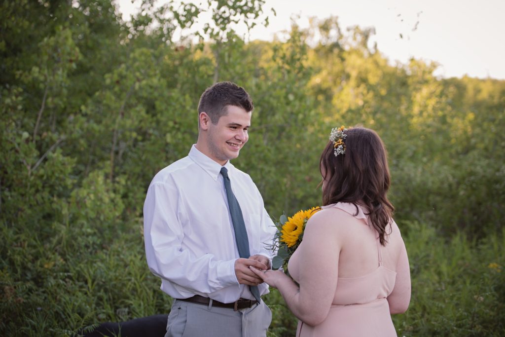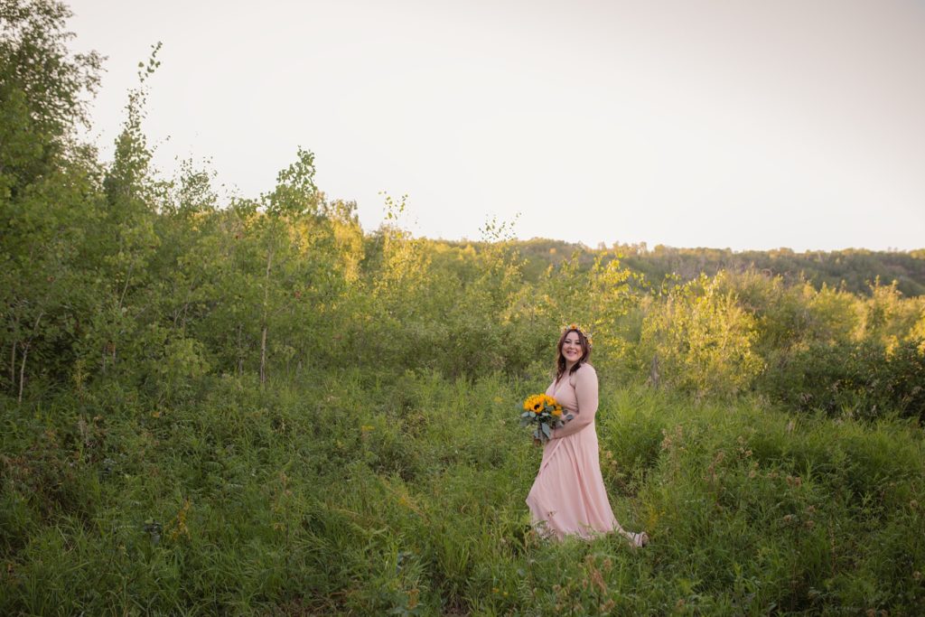 We drove out to meet at the Gabriel Bridge near Rosthern, Saskatchewan. They chose that location because they met in Rosthern when they were in high school. We did a quick first look before they exchanged vows and then continued on with taking photos in the late evening summer sun.