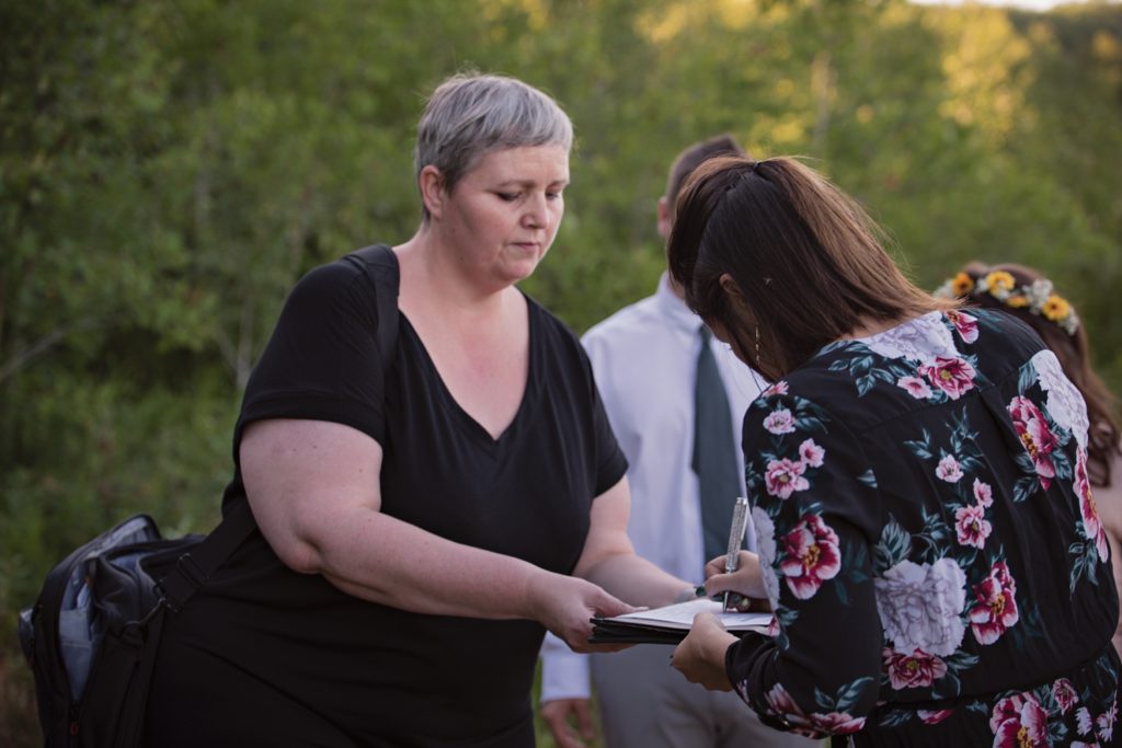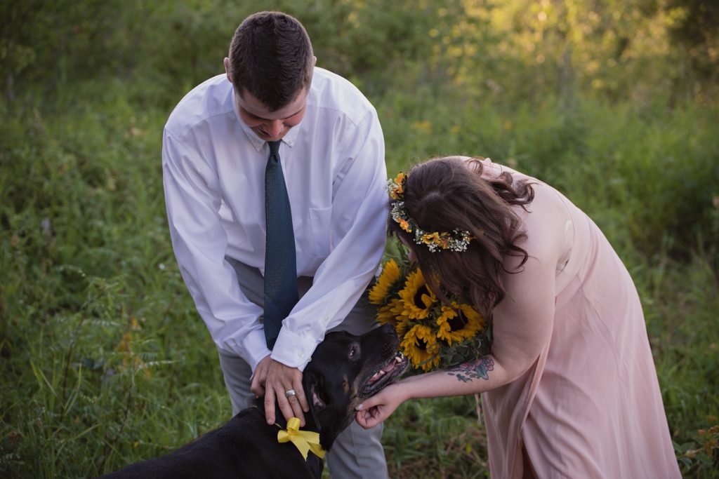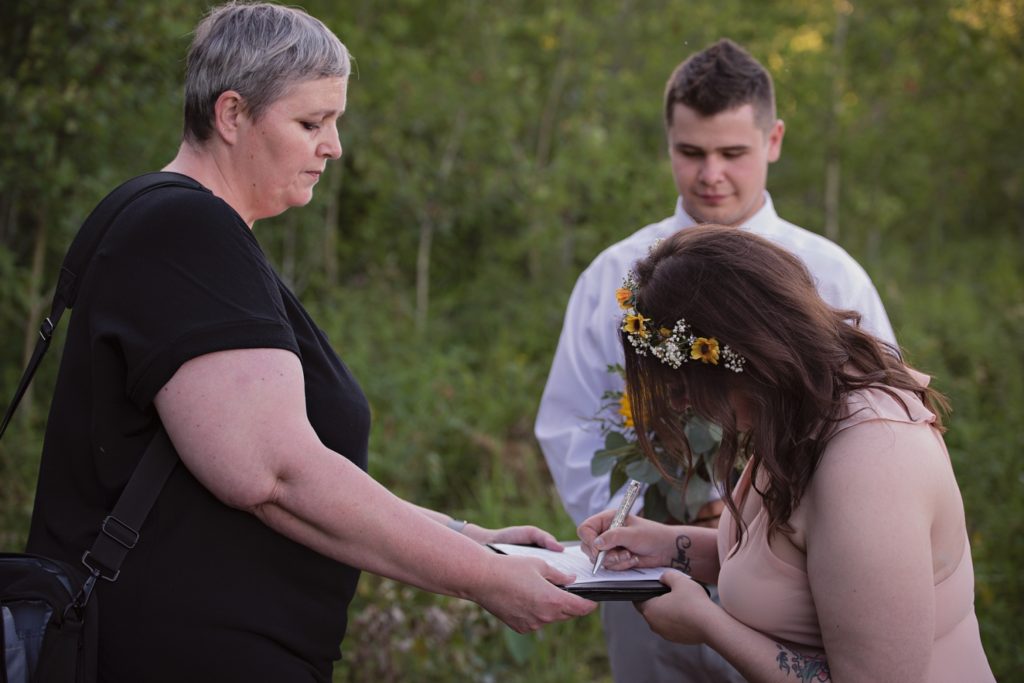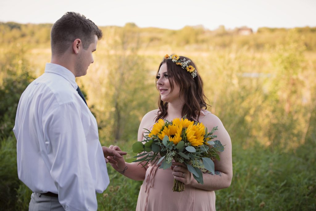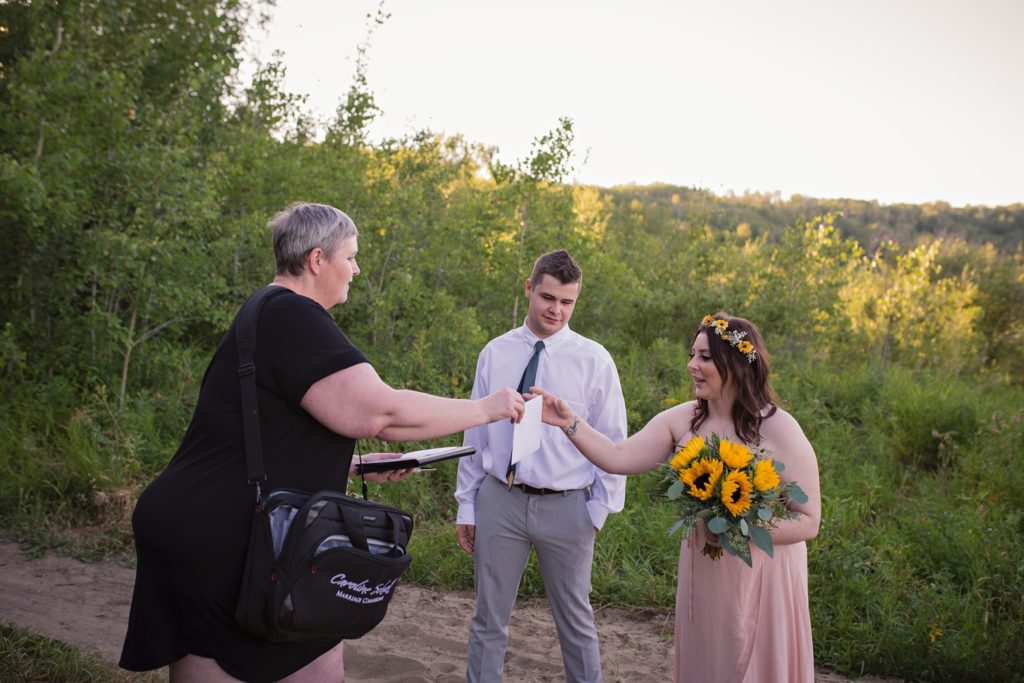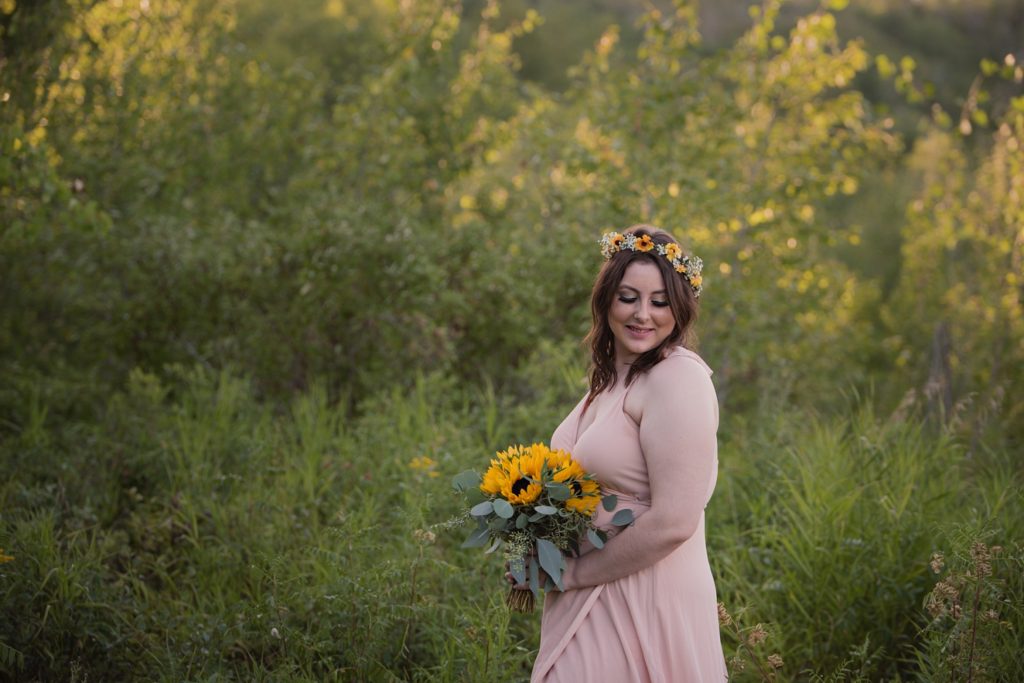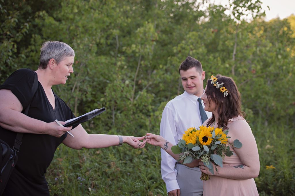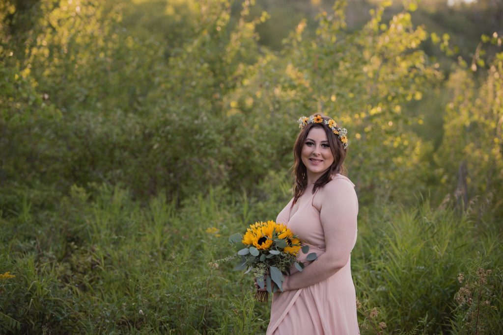 Flash forward after a few texts, and we went into planning mode. I sent her a name of a marriage commissioner. I pulled up a website for a dress, and we ordered the one she picked right then and there. I told her I know a fantastic florist that I’d contact about making a bouquet. Her only request was that the bouquet had sunflowers in it. What a bright sunny pop of color they brought!