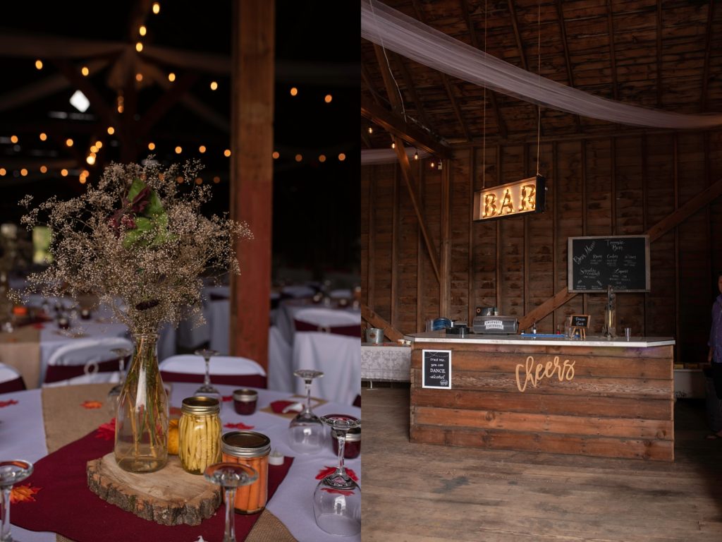 They strung string lights all across the barn for beautiful sparkly throughout the night. On the tables for favors were jars of homemade jam, and home canned pickled beans and carrots were part of the table décor, but also there for guests to enjoy with a caesar from the bar, or just as a snack throughout the night.