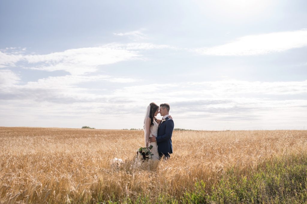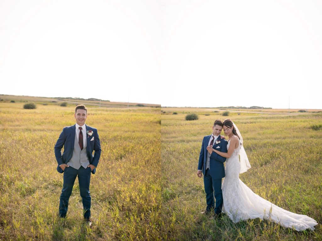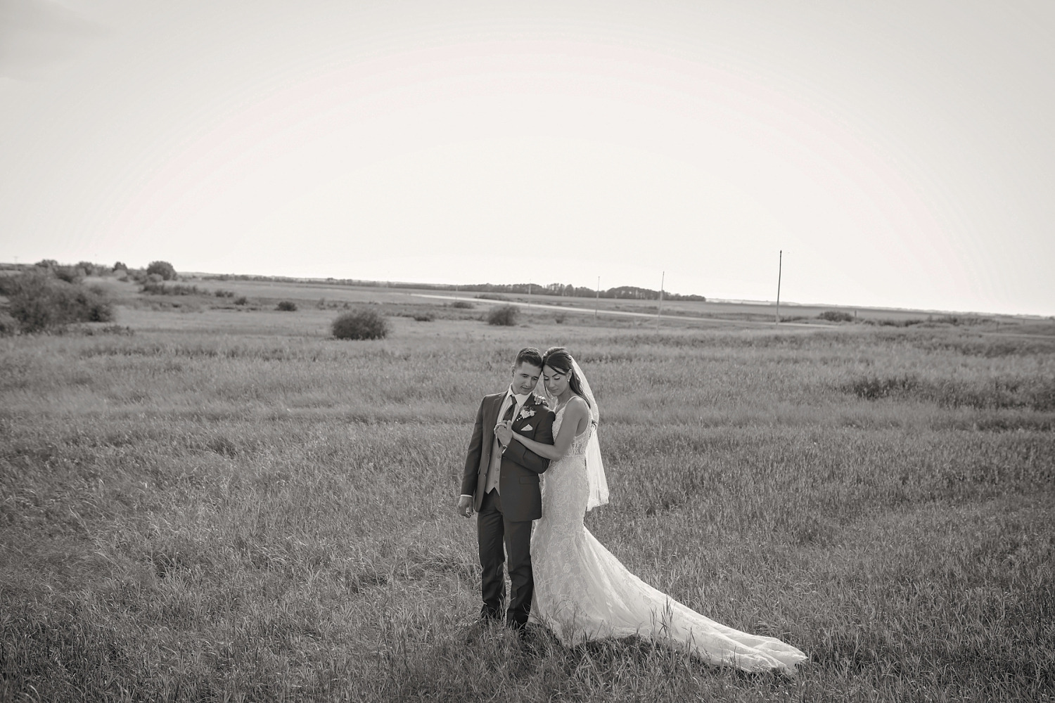 bride and groom cozying up in a empty field